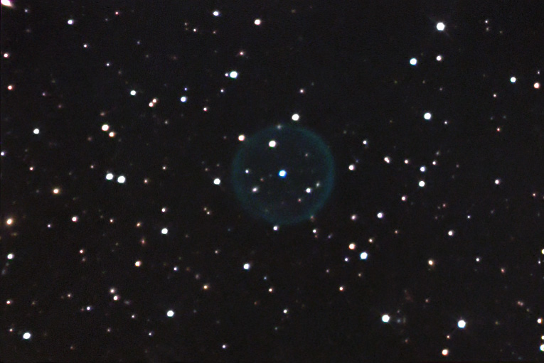 This stunning object is a very dim perfectly formed ring planetary nebula, at a faint 13.7 integrated magnitude. The 15.6 magnitude blue central star is perfectly centered in this remarkable object. It is big too, spanning 3 arcmins in diameter, and has a splendid turquoise coloration. There are numerous anonymous galaxies in this field. Two are inside the nebula itself, one is located 8:00 near the rim, and at the very top right on the rim is a fainter one. A subject for a much larger telescope might be the galaxy cluster located to the lower right, just to the right of the bright star. This anonymous chain seems to have quite a range of colors from reds to bluish. Instrument: 12.5" f/5 Home made Newtonian Platform: Astrophysics 1200 QMD CCD Camera: SBIG ST7E w/Enhanced Cooling Exposure: LRGB = 60:20:20:36 (RGB Binned 2x2) Filters: RGB Tricolor Location: Payson, Arizona Elevation: 5150 ft. Sky: Seeing FMHW = 2.8 arcsec, Transparency 8/10 Outside Temperature: 10 C CCD Temperature: -25 C Processing: Maxim DL, Photoshop, AIP4WIN, PW Pro.