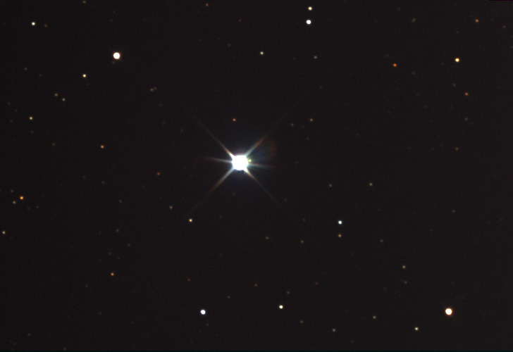 This object is seldom photographed because of its extreme faintness and proximity to 4.4 magnitude mu Orionis. This spectral class A2 star is so close, that film images nearly always hide the planetaries image completely, and George Abell only discovered it on the Poss plates by noting a small portion of it protruding from the stars overexposed glow. The planetary itself is listed as 14th magnitude, but a sizable 37 arcseconds in diameter. The 20th magnitude central star is not seen here. Just above mu, the bright star in the center of the image is an orange "object". This is classified as a non star in the Guide Star Catalog. This CCD image not only records the nebula completely separated from the star, but its green color with a red rim. This image was taken by combining 21 ten second exposures in a red luminance, and 5 each 10s RGB. Instrument: 12.5" f/5 Home made Newtonian Platform: Astrophysics 1200 QMD CCD Camera: SBIG ST7E w/Enhanced Cooling Exposure: RRGB = 3.5m:50s:50s:50s Filters: RGB Tricolor Location: Payson, Arizona Elevation: 5150 ft. Sky: Seeing FMHW = 2.5 arcsec, Transparency 8/10 Outside Temperature: 0 C CCD Temperature: -25 C Processing: Maxim DL, Photoshop, AIP4WIN