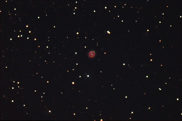 This Planetary nebula, also known as IC289, is small at 35 seconds, but relatively bright at 12.3 magnitude. This made it a perfect target for the full moon nebula shoot done every month here during a time normally most telescopes are put to little use. The red oval shaped nebula has green tips from OIII emission, and a central star of 15.9 magnitude. No other deep sky objects are in the same field, here 14 mins on a side. As is usual for bright planetaries, we shoot 2 each RGB frames of 10 minutes each, and synthesize a L channel image by adding the frames together. This greatly enhances the objects details and gives a much more solid signal to noise image. Instrument: 12.5" f/5 Home made Newtonian Platform: Astrophysics 1200 QMD CCD Camera: SBIG ST7E w/Enhanced Cooling Exposure: LRGB = 60:20:20:20 (RGB Binned 2x2) Filters: RGB Tricolor Location: Payson, Arizona Elevation: 5150 ft. Sky: Seeing FMHW = 2.0 arcsec, Transparency 8/10 (but Full Moon) Outside Temperature: 0 C CCD Temperature: -35 C Processing: Maxim DL, Photoshop, AIP4WIN, PW Pro.