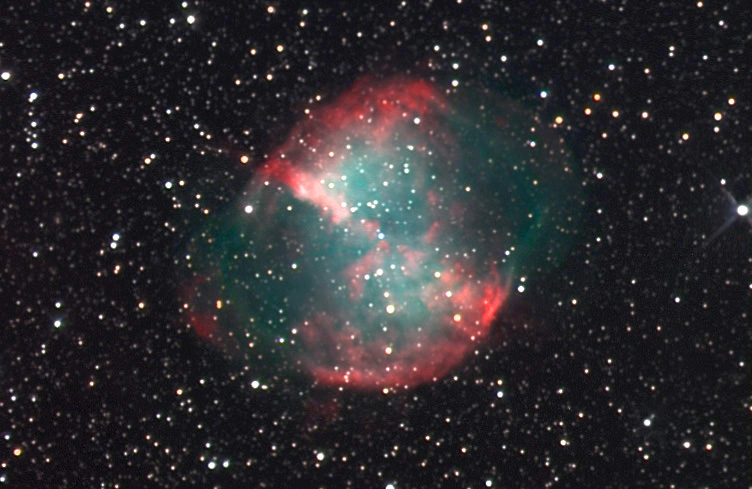 This huge spherical planetary nebula rides high in the evening skies during late summer evenings, and presents a perfectly sized CCD target. OIII and Ha nebulosities combine to form a sharp edged spherical shell, surrounding the blue central star. Also known as NGC6853, this 7.6 magnitude object is one of the brightest of its class in the sky, only outdone by a small handful of smaller objects. M27 is 6.7 minutes in size officially, however it is much larger if you count the outer ears seen here. Instrument: 12.5" f/5 Home made Newtonian CCD Camera: SBIG ST7E w/Enhanced Cooling Exposure: LRGB = 60:20:20:20 (RGB Binned 2x2) Filters: RGB Tricolor Location: Payson, Arizona Elevation: 5150 ft. Sky: Seeing 7/10, Transparency 8/10 Outside Temperature: 60F CCD Temperature: -20 C Processing: Maxim DL, Photoshop, PW Pro, AIP