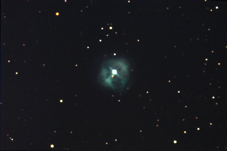 Located on the extreme northern border of Taurus, this photographically challenging object beckons at the zenith on warm August mornings before the start of twilight. This unusual planetary nebula has a brilliant 9.4 mag central star surrounded by a very dim and diffuse nebula. The combination makes for a difficult object to image satisfactorily, and LRGB type images would not work because of the stars brightness. This one was taken as an RGB, and had minimal blooming of the central star. The nebula itself is rated at 10th magnitude, and 1.9 arcmins in size. The inner disk is green in color, with a faint outer halo, seen dimly here. Instrument: 12.5" f/5 Home made Newtonian CCD Camera: SBIG ST7E w/Enhanced Cooling Exposure: RGB = 20:20:20 Filters: RGB Tricolor Location: Payson, Arizona Elevation: 5150 ft. Sky: Seeing 8/10, Transparency 8/10 Outside Temperature: 19 C CCD Temperature: -20 C Processing: Maxim DL, Photoshop, PW Pro.