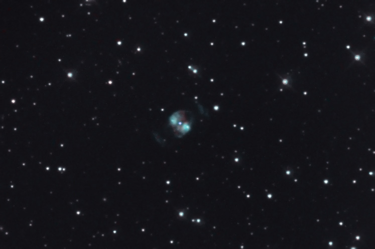 Discovered by Pease in 1917, this 13th magnitude bipolar object is 55 seconds from tip to tip, and displays the common multiple shell structures visible in many planetaries from earlier ejection events. Most color images available reveal a greenish nebula with a ruddy interior. Less than perfect seeing an moonlight were factors in this image. Instrument: 12.5" f/5 Home made Newtonian Platform: Astrophysics 1200 QMD CCD Camera: SBIG ST7E w/Enhanced Cooling Exposure: LRGB = 60:20:20:36 (RGB Binned 2x2) Filters: RGB Tricolor Location: Payson, Arizona Elevation: 5150 ft. Sky: Seeing FMHW = 2.7 arcsec, Transparency 8/10 Outside Temperature: 15 C CCD Temperature: -25 C Processing: Maxim DL, Photoshop, AIP4WIN, PW Pro.