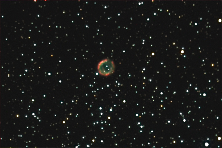 Located just north of the center of the bright star cluster M46, this gem shines at 10.1 magnitude amongst a sea of cluster stars. It is large for a planetary, at 64 arcseconds and reveals a wealth of color details from the ionized gasses within. No visible galaxies lay in this field, being too close to the galactic equator. The central star is barely seen here. it is a very faint blue object, just to the lower left of the brightest star within the ring. This 18th magnitude object is nearly swamped by the nebular light. Processing: Calibration, RL deconvolution, final brightness adjust. Instrument: 12.5" f/5 Home made Newtonian Platform: Astrophysics 1200 QMD CCD Camera: SBIG ST7E w/Enhanced Cooling Exposure: LRGB = 60:20:20:36 (RGB Binned 2x2) Filters: RGB Tricolor Location: Payson, Arizona Elevation: 5150 ft. Sky: Seeing FMHW = 3.5 arcsec, Transparency 8/10 Outside Temperature: 0 C CCD Temperature: -35 C Processing: Maxim DL, Photoshop, AIP4WIN, PW Pro.