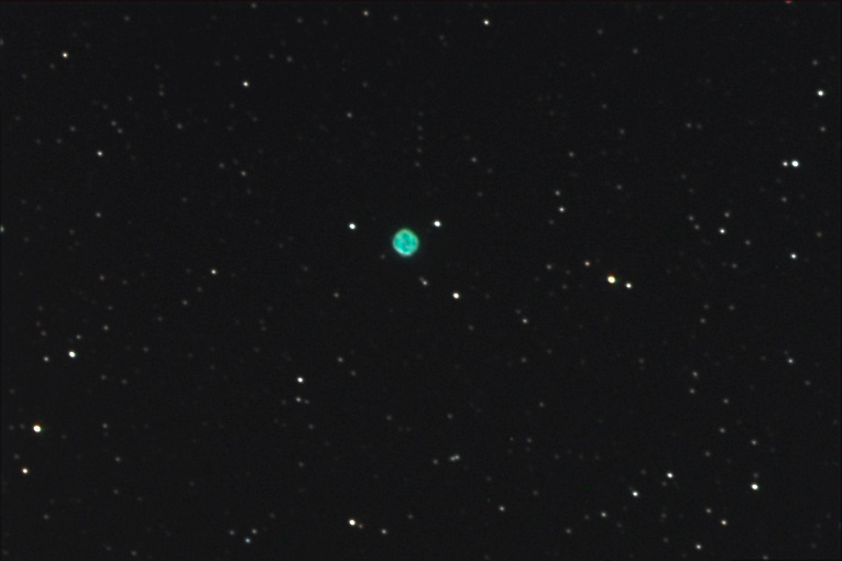 One of the brightest planetaries in the sky, this deep southern object is only 48 arcseconds across, but blazes at 9.9 magnitude. The 17th magnitude central star was washed out by the bright object, and not seen. This object very much resembles the planet mars photographed with an amateur scope, but its GREEN. This object is about one degree due north of the famous nearby Barnards Galaxy, NGC6822. To preserve the color and luminosity at the same time on this difficult object, a synthetic L channel was derived from the RGB data, and processed seperately. This allowed the proper use of DDP to bring out the details in the very bright core of this object. Instrument: 12.5" f/5 Home made Newtonian Platform: Astrophysics 1200 QMD CCD Camera: SBIG ST7E w/Enhanced Cooling Exposure: RGB = 20:20:36 (RGB Binned 1x1) Filters: RGB Tricolor Location: Payson, Arizona Elevation: 5150 ft. Sky: Seeing 6/10, Transparency 8/10 Outside Temperature: 21 C CCD Temperature: -20 C Processing: Maxim DL, Photoshop, PW Pro.