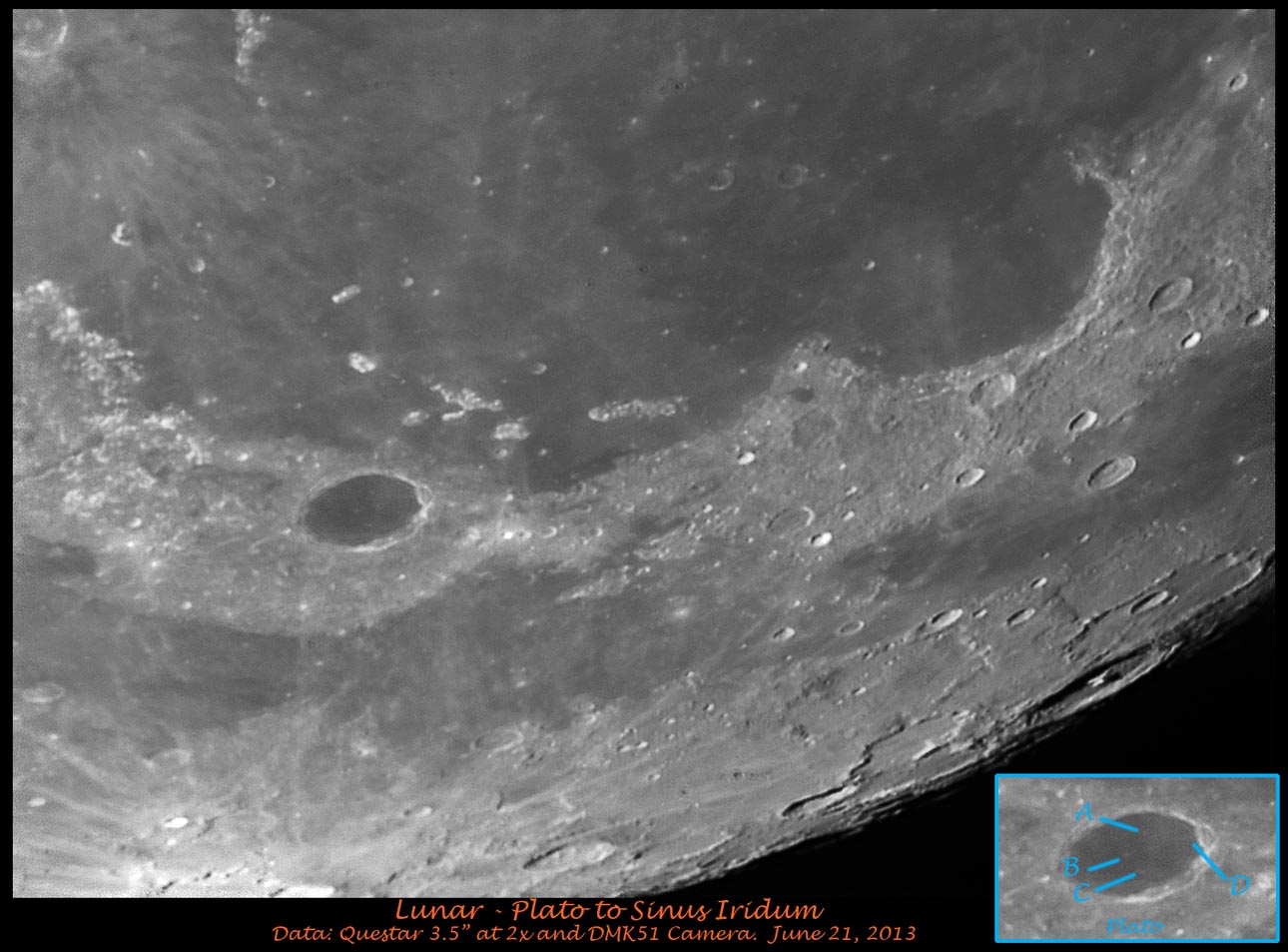 Four internal craters in Plato here. And the bay of Rainbows is to the right.