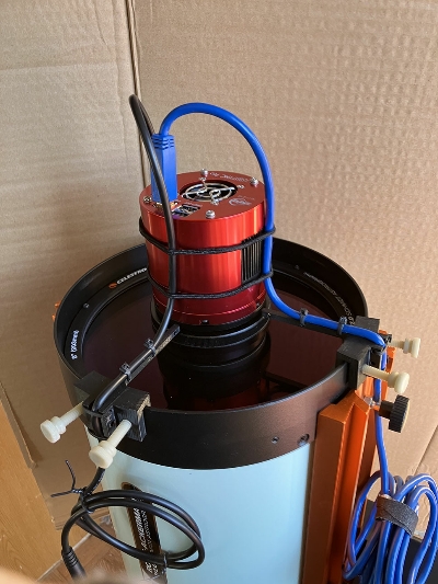 Most images just leave thier cables hang in an unruly fashion, and this results in strange and asymetrical spikes and extensions to brighter star images, which as you know looks very unprofessional. Curved arcs have been used as well for routing in a semicircular path, however we tried several commercial versions and they always produced ugly lumps on both sides of bright stars and made the stars look deformed or badly guided. Here we mount the cables on two tie down struts at 90 degrees. This produces a symetric cross shaped diffraction pattern like a Newtonian would produce however - because it is only on one side they are half the strength of a full cross. This means most of the time you will see just round stars, and only on the brightest stars will they show weak symetrical diffraction spikes that are far more acceptable than asymetric blobs achieved with other methods.