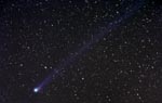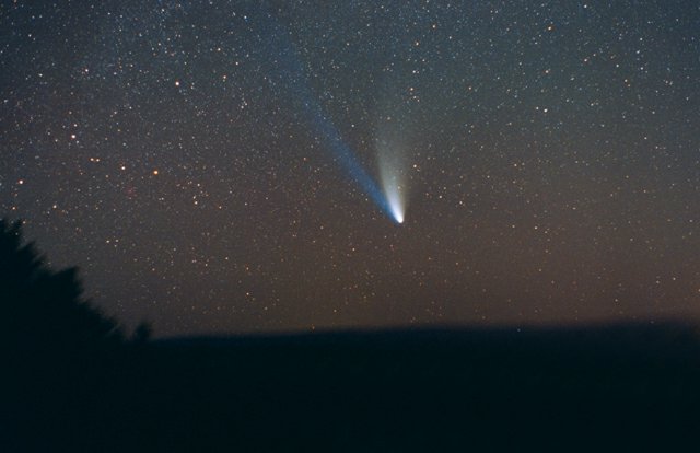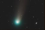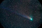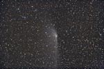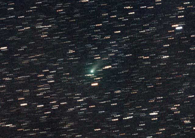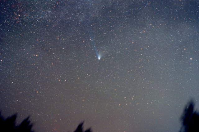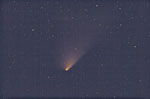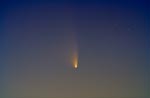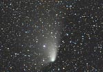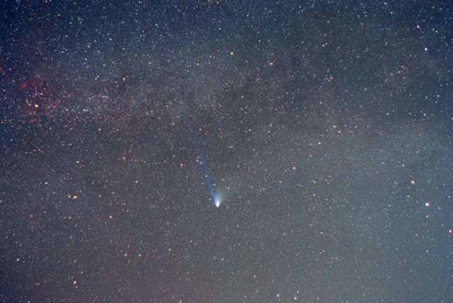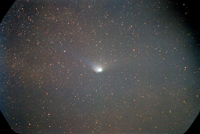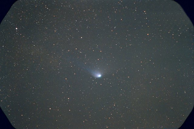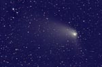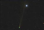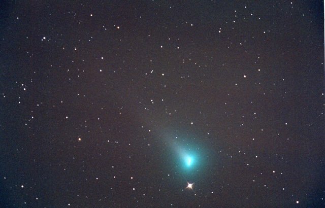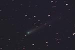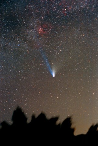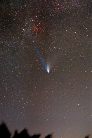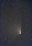 - 135mm f/4, 10 mins on Fuji 400 Super G Plus film. From Payson, Az by the author from his balcony. Here we can see the rapidly broadening plasma tail reaching up into the Cygnus region. At the upper left is NGC7000, the North America Nebula.