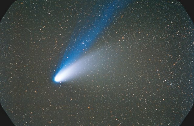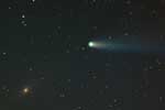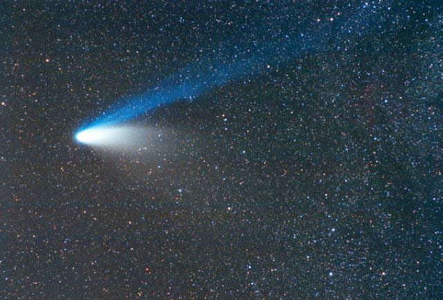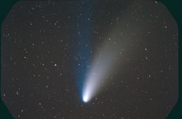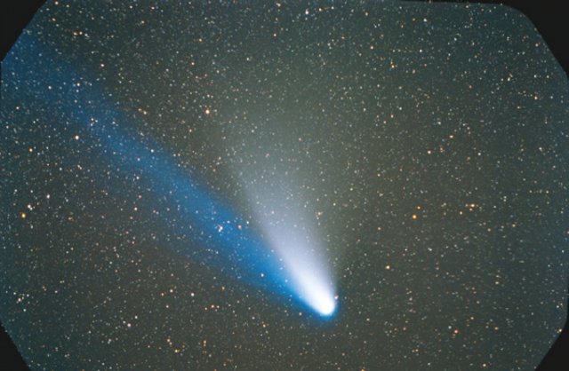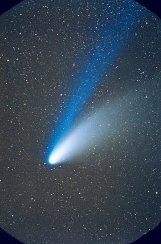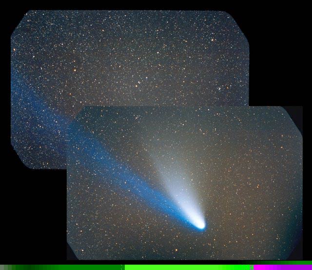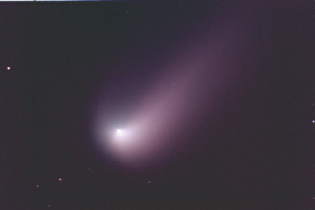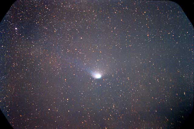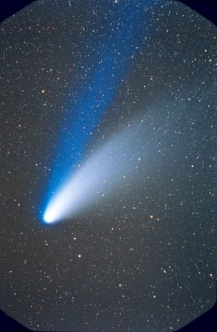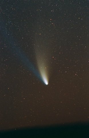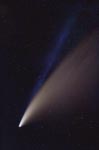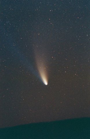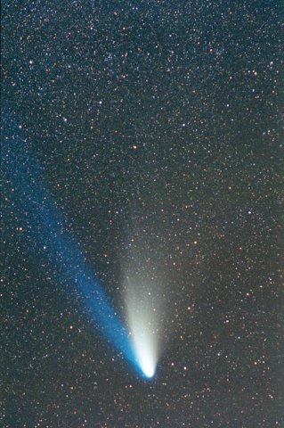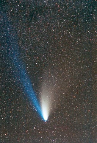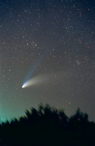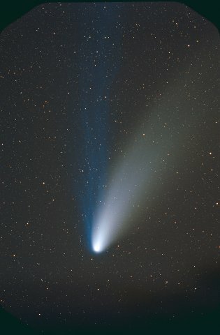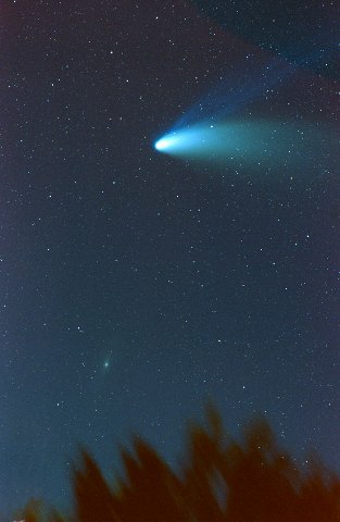 February 15, 1997 - 5.5" schmidt camera, two 5 minutes shots combined by sandwiching negatives. Note the extreme blue color of the plasma tail, and excellent separation of dust tail.