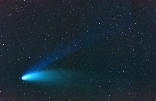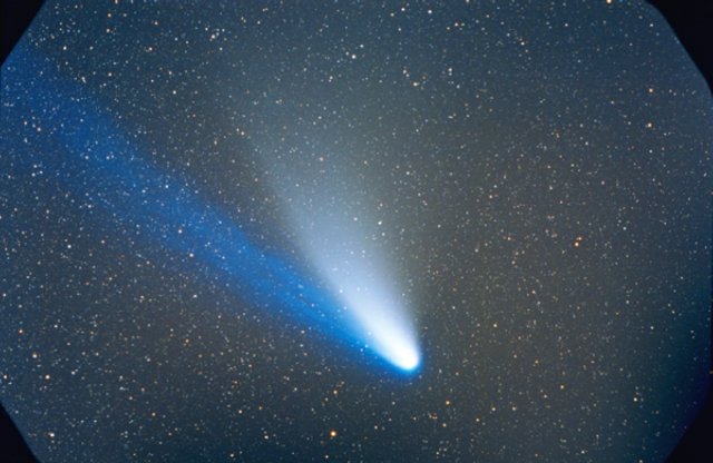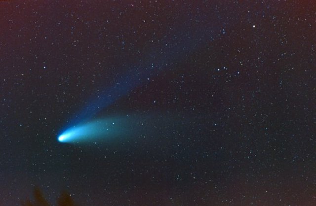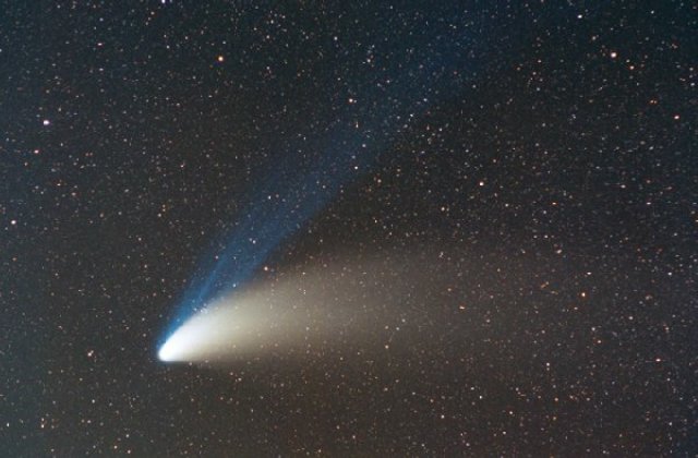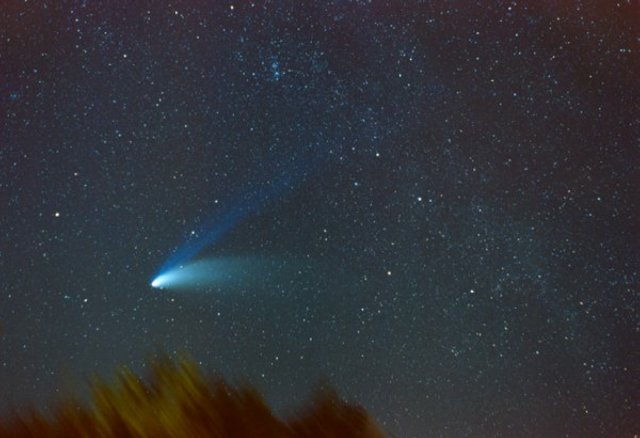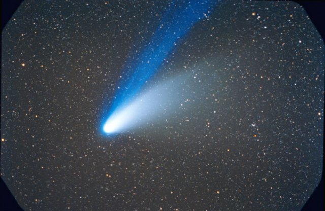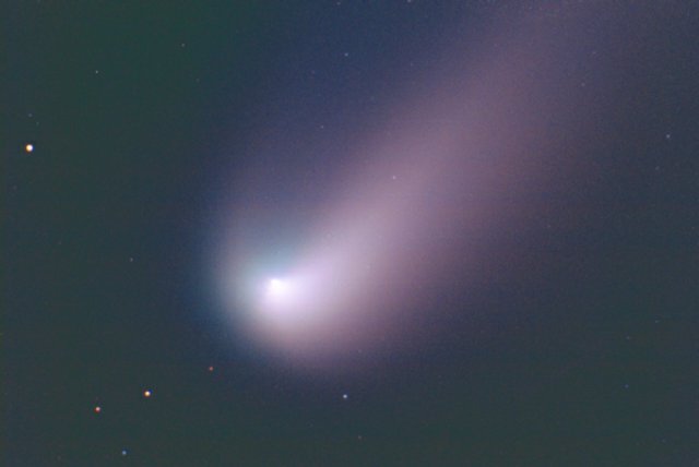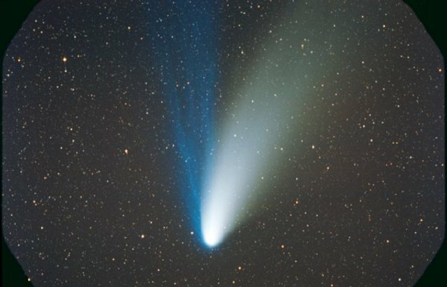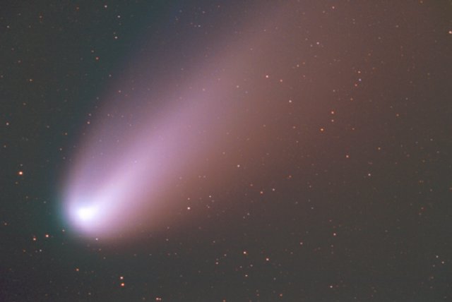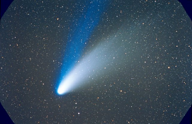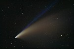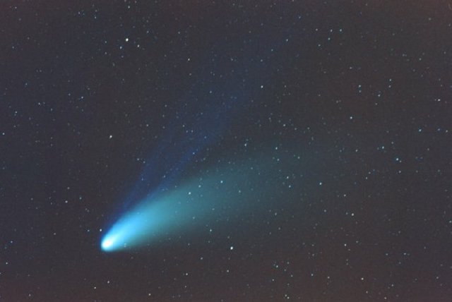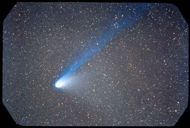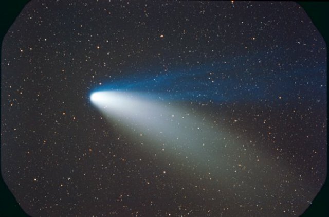 February 15, 1997 - 5.5" schmidt camera, two 5 minutes shots combined by sandwiching negatives. Note the extreme blue color of the plasma tail, and excellent separation of dust tail.