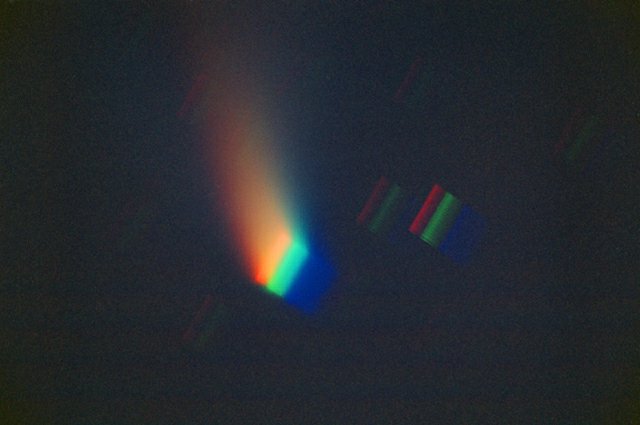 March 15, 1997 - Objective prism shot of the comet. A 400mm f/6.3 lens was shot into a prism at the comet, producing this image. The camera was stationary, and the comet and stars were allowed to trail for 5 minutes perpendicular to the prisms dispersion. The extra yellow spectral line seen was the cause of the comets nucleus to take on a yellowish tint to the naked eye. Pro 400ppf.