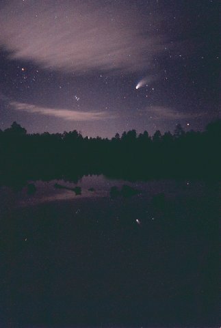 April 13, 1997 - 24mm f/2.8 lens, 45 seconds on Kodak Pro 400 ppf. This shot was taken by myself and photographer Vince Mele up on the Mogollon Rim in Northern arizona. We set up the tripod next to a very still pond, and shot the comet and its reflection in the water while cars whizzed by just behind us.