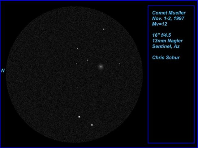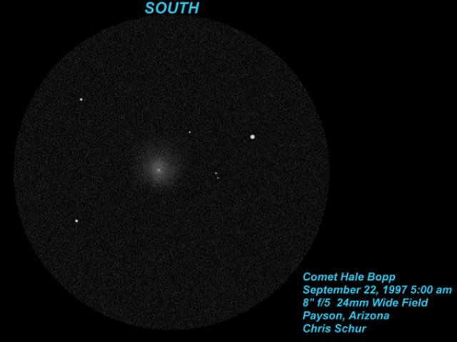 September 27, 1997 - Drawing with my 16" f/4.4 newtonian from our observing site on Zane Gray Highway up on the Mogollon Rim at 6500 feet. Observing with Tom Polakis and Bernie Sanden. Comet Hale/Bopp October 14, 1997 -12" f/5 Newtonian, 2 minutes exposure on Kodak Pro 400 ppf from Payson Arizona by the Author. This short exposure reveals a north-south enlongation of the coma, with a westward pointing tail glow. This very strange appearance has persisted for several weeks now. This will be my final shot with the 12 inch, since it was only 2 degrees up above the distant trees. The seeing was very poor as you may guess, but the comet was mag 5.5 and still detectable with my naked eyes. The yellowish color of the comet seen here is probably due to dust from atmospheric extinction. Comet Hale/Bopp October 5, 1997 - 5.5" f/1.65 Schmidt Camera, 4 mins on Kodak Pro 400 ppf from Payson Arizona by Chris Schur. The comet is seen as it skimmed the tree tops (green dark shape on bottom). This spectacular grouping with the open cluster NGC2477 in Puppis (fainter, richer cluster) and NGC2451 ( the very sparse cluster on the right edge, with bright orange star), and NGC2546 (the faint large group to the uppermost left). I had only about half an hour to get the shot composed, find a guide star and begin shooting because it had to be timed to go between tree branches. The mounting was 14 feet off the ground, on my back balcony as well, so lets just say it was very low on the south eastern horizon! The comet photographed as a sky blue color in the coma, indications of some gas activity still in progress. The comet was 5th magnitude, and very faintly visibly to the unaided eye as a large patch about half a degree across. The tail seen here is 1.5 degrees long or so. Comet Hale/Bopp September 27, 1997 #3- 135mm f/3.5 4 mins on Kodak Pro 400 ppf from Payson Arizona by Chris Schur. Comet Hale/Bopp - 135mm f/3.5 2 mins on Kodak Pro 400 ppf from Payson Arizona by Chris Schur. Comet Hale/Bopp September 27, 1997 #1 - 135mm f/2.5 6 mins on Kodak Pro 400 ppf from Payson Arizona by Chris Schur. The open cluster to the right of the comet is NGC2477 in Puppis. The comet was only 10 degrees up when these three shots were taken!