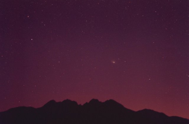 March 20, 1997 - 135mm f/4, 5 mins on Kodak Pro400ppf. Second of two images with the 135mm of the comet rising over the Mogollon Rim in Northern Arizona. As sunrise approaches the ultra red sensitvity of the Pro 400 film really brings out the ruddy sky.