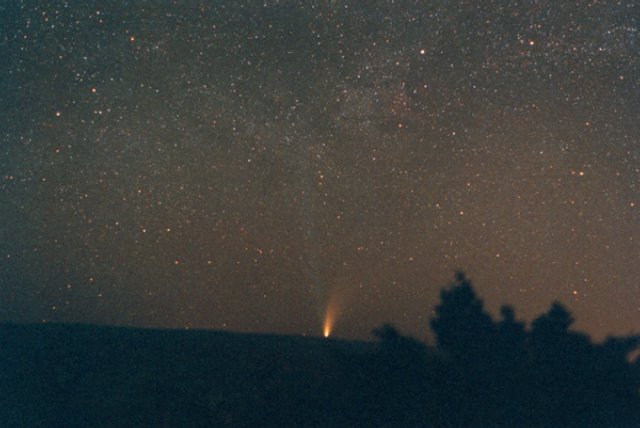 - Morning Rising Sequence. This is one of my most favorite shots so far of the comet, it was taken by putting the camera on a standard tripod, unguided, and opening the shutter with the lens cap on. Then I exposed the film for 20 seconds every 15 minutes seven times. The shot was with a 50mm lens at f/2.8 on Kodak Pro 400 ppf, and shows the extinction band, even present at my 5150 foot elevation yellowing the comet near the horizon. The goal was to also get the tail without the head as the comet rose, which is seen here as well just popping over the Mogollon Rim in Northern Arizona, which is some 20 miles north of my house. Comet Hale Bopp