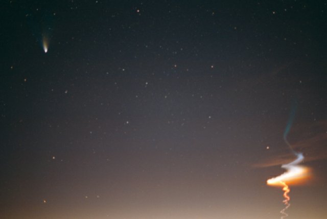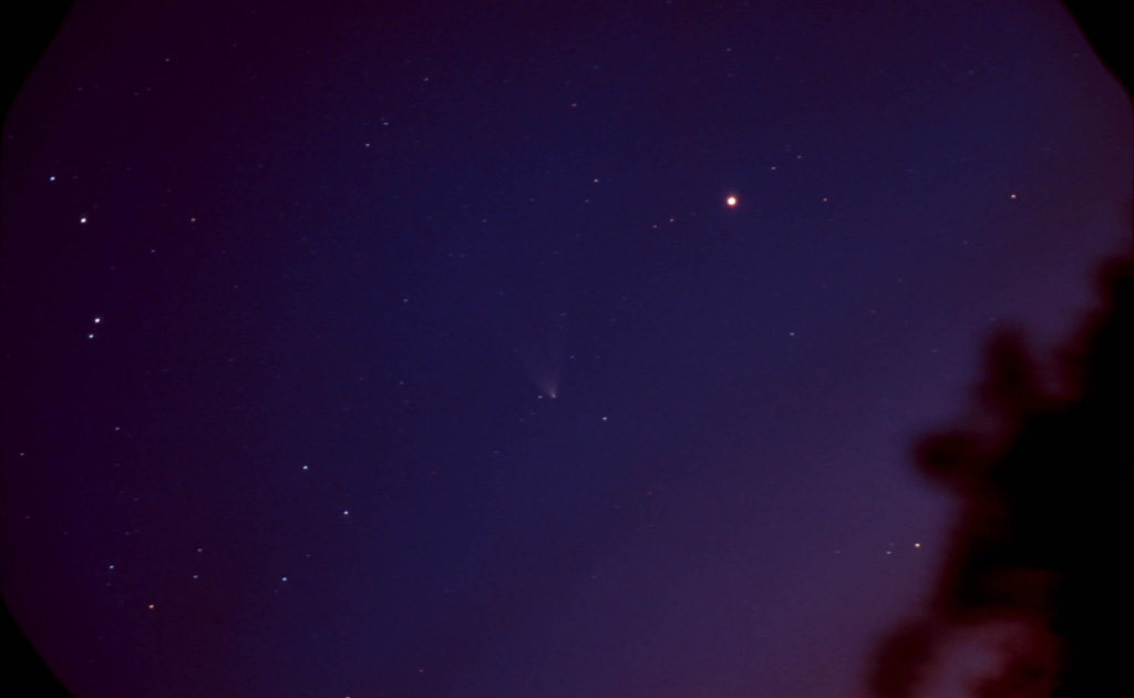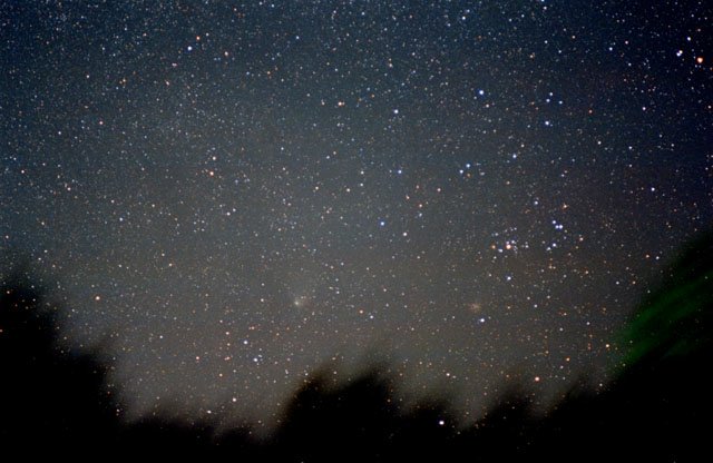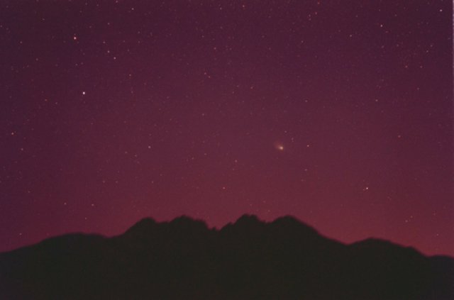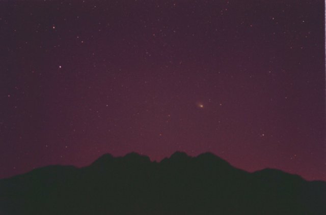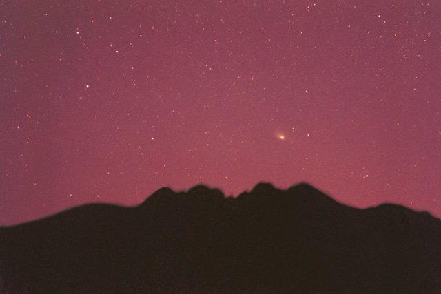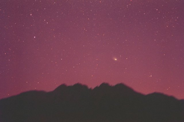 March 27, 1997 #2- 50mm f/2.8, 5 mins on Kodak Pro 400ppf. Later on, after the comet made its unique pairing with the Andromeda galaxy, I got this image with a wide angle lens, matching the naked eye appearance.