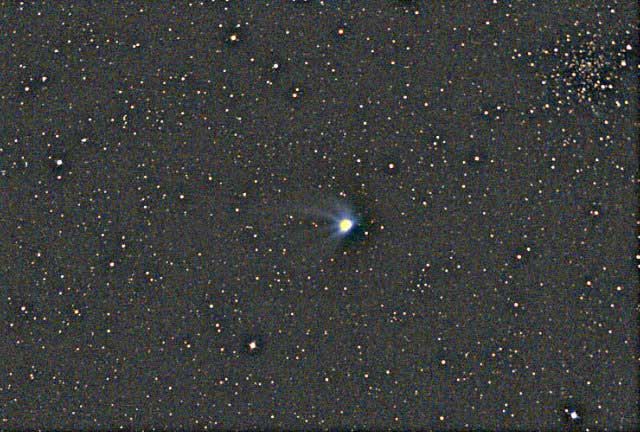 Comet Linear Y1 in Andromeda, 10-16-00. 6" f/3.6, SBIG237 CCD 10x1min. This is the faintest comet Ive shot yet, at 13.8 magnitude. There is a hint of a short tail pointing downward here. 1998 Images
