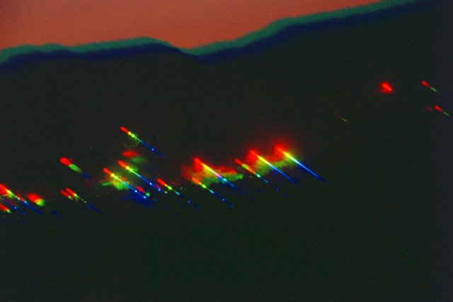 March 15, 1997 - Objective prism shot of the lights of Payson, some 4 miles distant. Compare this to the above image, and you will see that the prism does a fair job at resolving the spectra of bright sources.