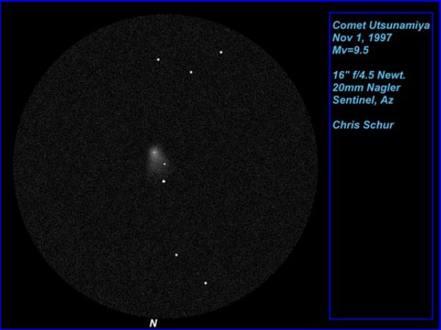 Comet Hale/Bopp September 22, 1997 - Drawing with an 8" f/5 newtonian on just before morning twilight. The comet was extremely low in the east south east, however good detail could be glimpsed. Comet Drawings on the night of November 1-2, 1997 at Sentinel Star Party Comet Utsunamiya October 31, 1997 - Yes, while others were trick-or-treating, I was out shooting the comet! This is a composite of five exposures, each five minutes in length on Kodak Pro400 ppf that was hypered for 8 hours. Taken with my 12.5" f/5 newtonian, the exposures are short due to the comets very fast motion across the sky. I sandwiched the negatives in the darkroom, (try that with five 10mb files sometime) and aligned the comets nucleus. Even in five minutes, the nucleus is trailed a very tiny amount, and the gap between the star trails is because of this. Notice the beautiful emerald green color. More Comet Hale Bopp