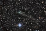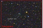 - 5.5" f/1.65 Schmidt Camera, 5 mins on Kodak Pro 400 ppf film. Second in a sequence of images with the schmidt, with the film holder rotated 90 degrees from the above image. Note the brownish-purple color of the dust component in the head and tail. This unusual color is a combination of the swan band component and an absorption effect similar to smog in the vicinity of the coma.