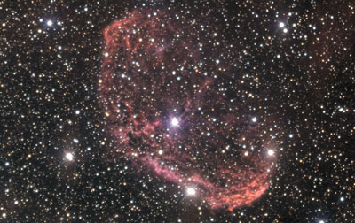 The hot stellar wind that drives this nebula is just below center, the 7.2 magnitude type O4 known as HD 192163. Such nebulas form when hot stellar winds blow bubbles and are know as "Wolf Rayet" stars. The resulting nebula is tattered and moving away from the star at high speed. The resulting nebula, NGC6888 is also known as Sharpless 2-105, it is 18 arc minutes long and gradiates in color from a deeper red to pinks from left to right. This is an RRGB image, the luminosity data was taken with the red filter. This object fits rather well on the ST8i chip, I took several one minute shots binned 3x3 to get the exact framing for this composition. Instrument: 12.5" f/5 Home made Newtonian Platform: Astrophysics 1200 QMD CCD Camera: SBIG ST8i NABG with Enhanced Cooling Guider: SBIG ST4 Exposure: RRGB = 120:20:20:40 (RGB Binned 2x2) RGB Combine Ratio: 1: .8: 1.2 Filters: RGB Tricolor Location: Payson, Arizona Elevation: 5150 ft. Sky: Seeing FWHM = 4.5 arcsec (Maxim DL - 10min subframe), Transparency 7/10 Outside Temperature: 15 C CCD Temperature: -20 C Processing Tools: Maxim DL, Photoshop, AIP4WIN, PW Pro, RW Debloomer.