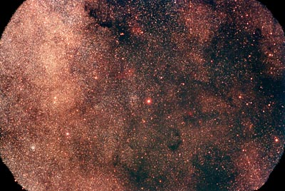 This gorgeous star cloud is in a field centered on the star alpha, in the constellation of Scutum. This field is filled with several emission objects, star clusters, plentiful dark nebula, and of course a very rich Milkyway field. A few of the more interesting objects are highlighted below: Clusters: The two most obvious star clusters is the splashy group just to the left of Alpha, this is CR387. And of course, the very bright starlike object in the lower left corner is M26. Emission Nebula: Sharpless 2-59 just above Alpha at about 11 o'clock. Straight up from Alpha, near the top in a dark nebula is Sharpless 2-60. A pair of smaller Sharpless objects lies to the lower left of Alpha, about 4 o'clock. This is Sharpless 2-58, and 57. Dark Nebula: Some very stark dark clouds lie here as well. At the top center, is Barnard 103, But far more interesting is Barnard 100, the dark semi circular nebula - like a negative of the Crescent nebula in Cygnus - just to the lower right at about 5 o'clock from Alpha. The dark round patch at the extreme lower right is Barnard 97. Instrument: 8" f/1.5 Celestron Schmidt Camera Platform: Homemade GEM Film: Kodak Supra 400 CCD Autoguider: ST4 Exposure: 2x8mins Filters: NONE Location: Happy Jack, Arizona Elevation: 6800 ft. Sky: Seeing 8/10, Transparency 8/10 Outside Temperature: 10 C Processing: Photoshop, PW Pro.