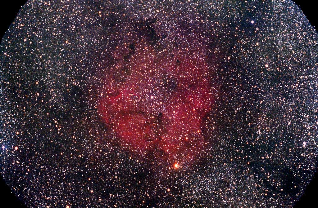 Countless stars and dark nebula fill this image, a stack of two 8 minute exposures on the scarce PJ400 film. Mu Cephi, the garnet star lies at the bottom of the frame, and the central open cluster is Trumpler 37, a rich cluster in a dense Milkyway field. The bright rimmed VDB142 lies on the left quadrant of the nebula, While to the lower left is B367 and B162. The width of the field here is 6.5 degrees. Instrument: 8" f/1.5 Celestron Schmidt Camera Platform: Homemade Film: Kodak PJ400 CCD Autoguider: None Exposure: 2x8mins Filters: UV Location: Happy Jack, Arizona Elevation: 6800 ft. Sky: Seeing 8/10, Transparency 8/10 Outside Temperature: -12 C Processing: Photoshop, PW Pro.