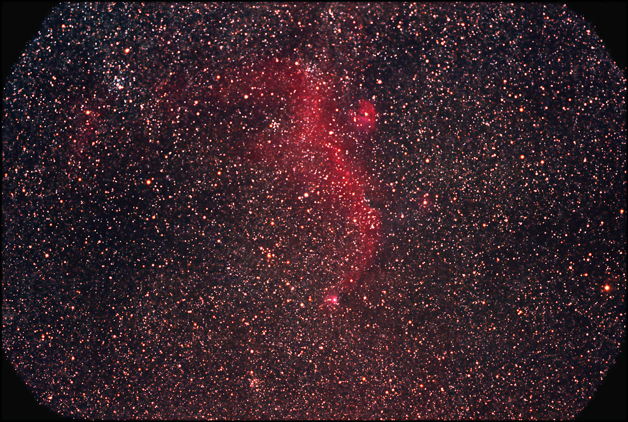 This complex region contains at least four open clusters, and numerous bright nebula in one area. The main extensive nebulosity is IC2177, also called the Seagull Nebula. Just below it, the small round detatched portion is Sh2-297, and the head of the Seagull is NGC2327. Instrument: 8" f/1.5 Celestron Schmidt Camera Platform: Astrophysics 1200 QMD Film: Pro 400 PPF CCD Autoguider: ST-4 Exposure: 3x 4mins Filters: UV Location: Payson, Arizona Elevation: 5150 ft. Sky: Seeing 8/10, Transparency 8/10 Outside Temperature: 0 C Processing: Maxim DL, Photoshop, PW Pro.