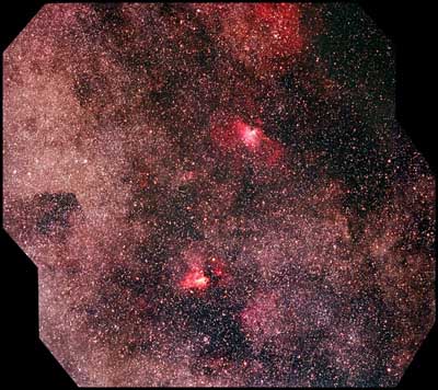 This field, about 8 degrees square was made from two deep schmidt camera images from Happy Jack. An enormous amount of Milky Way detail can be seen here, especially in the larger images. The three key red emission nebula in this field are M17 - The Swan Nebula just below center, M16 - The Eagle Nebula just above center, and Sharpless 2-54 as the amorphous object at the top. Numerous dark nebula can also be seen in this image. Barnard 95 is at the top edge on the left side, Barnard 313 on the left edge in a brilliant star field and Barnard 297 to the lower right corner. With such a huge field, one could go on and on concerning the hordes of deep sky objects in this field, it is left to the reader to sit with a star chart in lap, and explore the riches of this region! Processing note: These images are large file sizes because the tiny details in the original file could not be easily compressed without severe detail loss in the final image. Instrument: 8" f/1.5 Celestron Schmidt Camera Platform: Homemade GEM Film: Kodak Supra 400 CCD Autoguider: ST4 Exposure: 2x8mins Each Image Filters: NONE Location: Happy Jack, Arizona Elevation: 6800 ft. Sky: Seeing 8/10, Transparency 8/10 Outside Temperature: 15 C Processing: Photoshop, PW Pro.