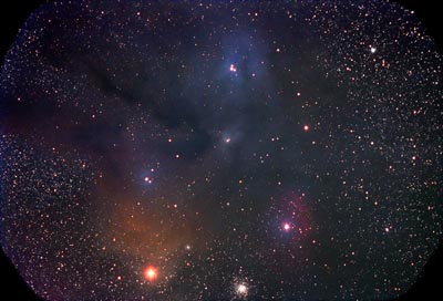 This region of both red emission nebulosity, and orange and blue reflection nebulosity is arguably the most colorful region in the entire sky for astrophotographers. In this single 8 minute exposure, a plethora of both bright and dark nebula are recorded. ( I usually intend to shoot images in pairs, we wont mention what happened to the second image) Of special interest in this image, are the following details. Blue reflection nebulas in this field include IC4604 at top, with IC4603 just above center. The small blue cloud just above the orange cloud to the left is IC4605. Now for a special treat, one of the VERY few reflection nebulas in the sky that is other than blue, we can see the orange colored IC4606, a reflection nebula from the heart of the Scorpion - Antares the brilliant star at bottom left. Curiously, a small tattered emission nebula, Sharpless 2-9 lies to the lower right part of the image. It appears to be illuminated by Sigma Scorpii, just to its left. But then again we can see a hint of blue in a faint reflection nebula surrounding Sigma as well. And of course the huge globular star cluster M4 is at the bottom center. One of the prominent dark nebula, Barnard 44 at center left is peculiar in that while the top portion is illuminated a blue color, the lower edge is reddish and it seems to merge with the orange reflection nebula IC4606. Instrument: 8" f/1.5 Celestron Schmidt Camera Platform: Homemade GEM Film: Kodak Supra 400 CCD Autoguider: ST4 Exposure: 8mins Filters: None Location: Happy Jack, Arizona Elevation: 6800 ft. Sky: Seeing 8/10, Transparency 9/10 Outside Temperature: 10 C Processing: Photoshop, SGBNR.