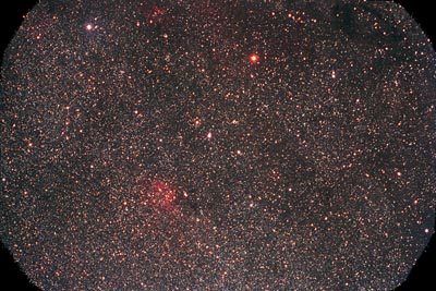 A complex and star filled region of clusters, emission nebulosity and dark nebula. Sharpless 132 is the large emission object to the lower left of center. Although a number of bright orange stars are involved in the nebulosity, they do not constitute a cluster. The other emission complex is a the top center, Sharpless 135. To its right is a faint cloud of unamed red nebulosity in the field. Some very striking dark nebula appear in this field as well. In the upper right is Barnard 171 and 170, and just to the right of S132 is Barnard 369. Instrument: 8" f/1.5 Celestron Schmidt Camera Platform: Homemade GEM Film: Kodak Supra 400 CCD Autoguider: ST4 Exposure: 2x8mins Filters: NONE Location: Happy Jack, Arizona Elevation: 6800 ft. Sky: Seeing 8/10, Transparency 8/10 Outside Temperature: 10 C Processing: Photoshop, PW Pro.