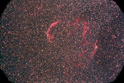What is the extent of the faintest, and most obscure sections of this famous object? To help answer this question, this deep set of images were taken at our ultra dark sky site of Happy Jack, Arizona. Countless stars can be seen in this image, along with numerous small isolated patches of nebulosity that are unnamed. In processing this image, the common practice of applying the minimum filter in PS was not used simply because the effect of removing most of the faint stars made the image look unrealistic, and I wanted to preserve the striking stellar background. Some notes on image size. JPG compression will not work very well on images with great amounts of fine detail in them. Here, there are so many tiny stars here that the file size is difficult to minimize without greatly sacrificing quality. Please bear with the download times, the larger files are worth the fine details to be had! Instrument: 8" f/1.5 Celestron Schmidt Camera Platform: Homemade GEM Film: Kodak Supra 400 CCD Autoguider: ST4 Exposure: 2x8mins Filters: NONE Location: Happy Jack, Arizona Elevation: 6800 ft. Sky: Seeing 8/10, Transparency 8/10 Outside Temperature: 10 C Processing: Photoshop, PW Pro.