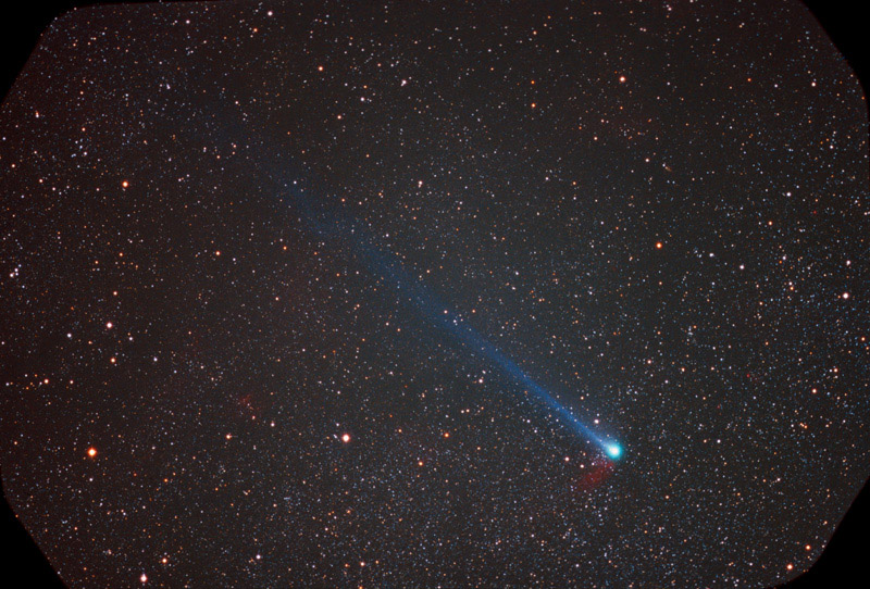 This mornings image was taken with my 5.5 inch schmidt camera to accommodate the long ion tail seen here in this image. Touching the comets head is NGC7538 and the entire field is strewn with red emission nebulosities. This single 10 minute exposure (longer because of the obstructing film holders) was on Kodak E200, pushed 1 stop to bring up the background Dmin for scanning. A Nikon LS2000 scanner was used to create a 36bit color file, which was processed in Photoshop 6. The dust tail is not recorded here, either it is gone or not seen with the red sensitive film. Instrument: 5.5" f/1.65 Celestron Schmidt Camera Platform: Astrophysics 1200 QMD Film: E200 +1 stop CCD Autoguider: ST-7 Exposure: 10m Filters: none Location: Payson, Arizona Elevation: 5150 ft. Sky: Seeing 8/10, Transparency 7/10 Outside Temperature: 10 C Processing: Maxim DL, Photoshop, PW Pro.
