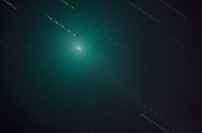 Although fading to 4.5 magnitude, the comet is rises early in the evening just under the head of Draco in the East. A two degree long ray type tail was seen in binoculars which shows faintly to the lower right in this image, the comet was offset in this shot to accomidate any possible tail detail. Note the leading edge jet in the coma, indications of much internal action. The deep green of Cyanogen is starting to fade out, but is still the dominant color here. Processing: Image taken in RGB, and combined for color data. A synthetic Luminosity frame was created by adding R+G+B creating a much lower noise L channel. Richard Lucy deconvolution and DDP was applied to the L channel, and combined with the RGB data for this LRGB image. Instrument: 12.5" f/5 Home made Newtonian Platform: Astrophysics 1200 QMD CCD Camera: SBIG ST7E w/Enhanced Cooling Exposure: LRGB = 15m:5m:5m:5m Filters: RGB Tricolor Location: Payson, Arizona Elevation: 5150 ft. Sky: Seeing FMHW = 2.5 arcsec, Transparency 8/10 Outside Temperature: 10 C CCD Temperature: -25 C Processing: Maxim DL, Photoshop, AIP4WIN