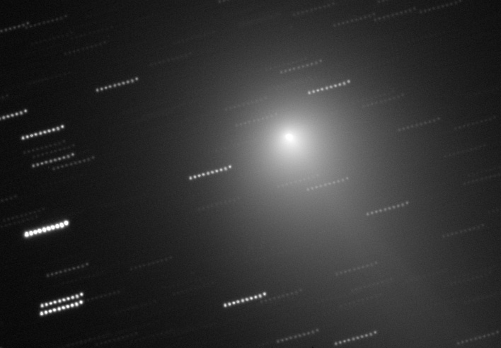 Above: Larson-Sekanina filtration using AstroArt. This powerful method brings out the 90 degree fans emanating from the nucleus. the tail is seen to the lower right, and the two jets are seen going to the 1:00 and 7:00 positions from the core. The filter works by rotating the coma around the nucleus and subtracting the result from the original image. This removes all symetrical nebulosity, and leaves the difference image.