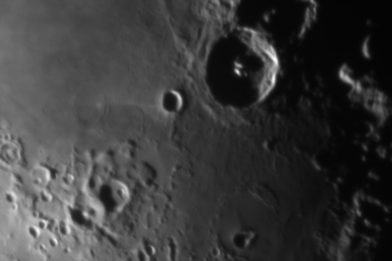 This image was processed by deconvolution with AIP Van Cittert 10 times with a radius of 3.2 pixels, and gamma adjusted for photo realistic appearance. Note the extremely fine craterlets and ghost craters. Compare this to the starting original RAW image to see the results of careful processing.
