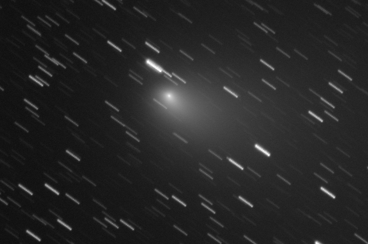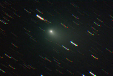 This brightening comet is now well placed in the eastern sky and passes near the zenith near midnight. The two here show a 7th magnitude object, easily visible in my 11x80 binoculars with a short stubby tail. The upper black and white image is a high resolution shot, 10 one minute long exposures added with the nucleus in register. DDP was applied to allow the bright inner core to be displayed at the same time as the broad faint fan tail. The lower image, was also taken with the 12.5 inch f/5, and is binned 2x2 and in color. 15 one minute exposures, 5 in each color were combined to form this color image. The color in the lower image could not be combined with the upper image as an LRGB easily because the star trails would not match up between the separate exposures.