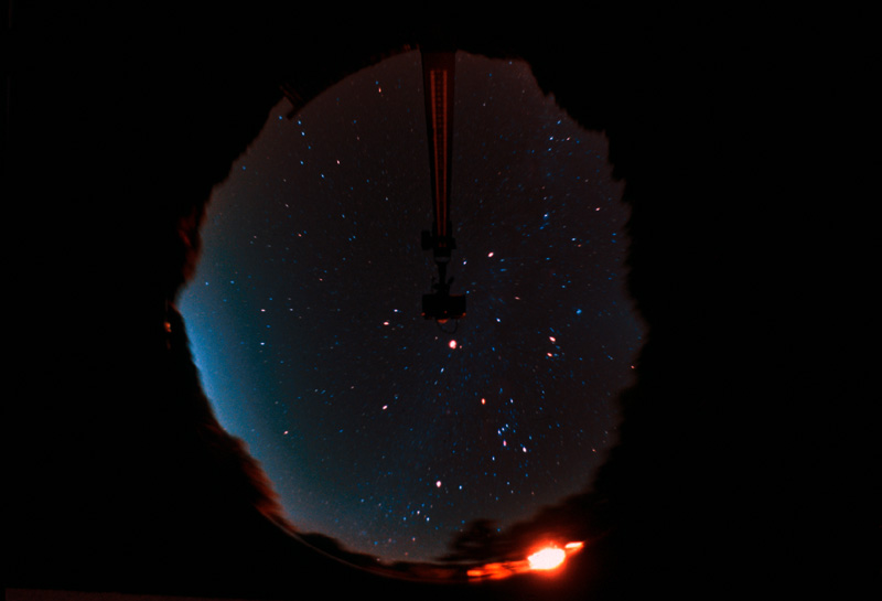 These two images represent tracked and untracked exposures with the new enlarger stand All Sky Camera. The first image was taken by placing the assembly on top of the optical tube assembly of my 12.5 inch Newtonian pointed at the zenith, and exposing for 15 minutes. A 50mm f/2.8 lens was used. This image has north up, and has been mirror reversed to appear as the true sky would. Kodak E200 slide film was used, and scanned with a Nikon Coolscan LS2000 slide scanner. The glow of Payson is to the left, and the neighbors porch light at bottom.