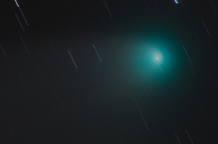![]() Running 3.5 Magnitude and with 2 degrees of tail easily visible to the naked eye, this comet provided a 20 minute window of opportunity above the trees and in a dark moonless sky last night. The Green channel was very bright, as is the final RGB image. Star trails from tracking on a rapidly moving comet are multicolored from stacking the individual color frames to form the final image. I had to manually guide on the nucleus of the comet to get this image, between exposures, I recentered the comet manually to keep the comet from moving off the shot. Instrument: 12.5" f/5 Home made Newtonian Platform: Astrophysics 1200 QMD CCD Camera: SBIG ST8i NABG Guider: Manual Guiding on Nucleus Exposure: LRGB = 16:4:4:8 (RGB Binned 2x2) RGB Combine Ratio: 1: .8: 2.4 Filters: RGB Tricolor Location: Payson, Arizona Elevation: 5150 ft. Sky: Seeing FWHM = 5 arcsec Transparency 8/10 Outside Temperature: 20 C CCD Temperature: -20 C Processing Tools: Maxim DL, Photoshop, AIP4WIN, PW Pro