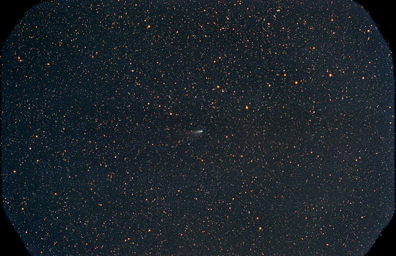 During the morning of the fourth of July, the new comet rose very early in the moring in the constellation of Perseus. This image, taken with my 8 inch schmidt camera at f/1.5 was on non hypered Kodak PJ400 emulsion, and developed in a Bessler CN2 Chemistry. Two four minute exposures were scanned and combined by multiplication in the digital darkroom in Photoshop 5.5 to make this final image. The registration of the two images was accomplished in Picture Window Pro, by aligning the comet head images in the two shots since the fast moving comet had changed position between two frames. Visually, the comet was near magnitude 7.5 and seen easily in 11x80 binoculars with about half a degree tail.