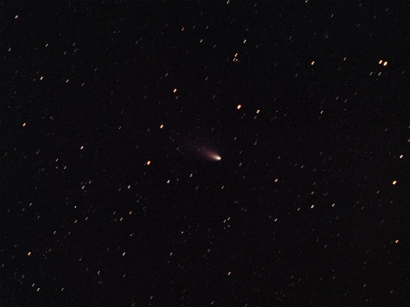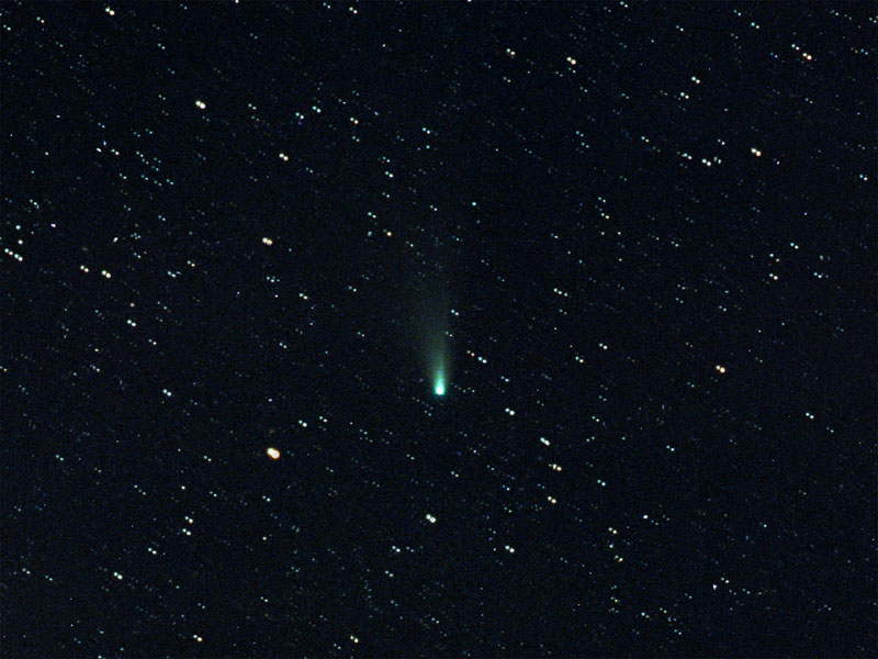 Blazing across the sky at 6 degrees per day, photographing the comet is getting to be a real tracking challenge. For this shot, two 2 minute exposures with an 8 inch f/1.5 schmidt camera on Kodak PJ400 from my backyard in Payson Arizona were taken, and scanned then digitally combined to create a single 4 minute equivelent exposurre. Since the comet moved about an arc minute between frames, the comet had to be registered at the expense of doubling the stars. This makes the comet appear stationary, while the stars whiz by. This image is cropped from the center half of the negative.