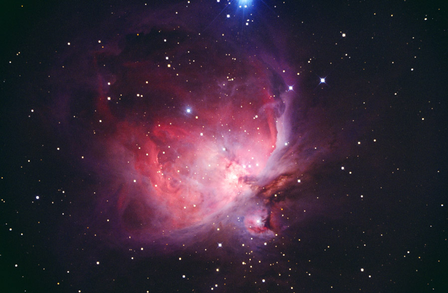 This film based image was made possible by a long series of short to deep exposures that was guided faithfully by the ST-4 Autoguider. The core is normally overexposed to get the faint outer nebulosity in standard images, but here a technique called Luminance Layering was used. This entails a series of exposures in this case ranging from 90 minutes, down to 5 minutes and combined in Photoshop into one final image, with the shortest exposure on the bottom of the stack. The over exposed regions are removed successively from each layer leaving a cut out to see the layer below. This method retains both bright and dim nebulosities in one image. CCD imagery can employ this same technique for especially bright objects.