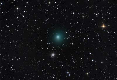 beautifully colored comet lies in Andromeda, near M31. Now at