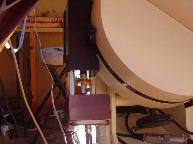 The mounting started out as a Astrophysics 1200 QMD mount, but because of extensive design problems, I had to remachine the drive section to get satisfactory tracking performance.