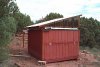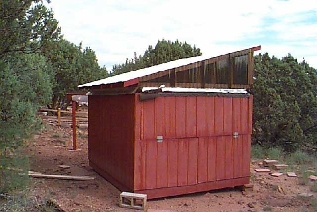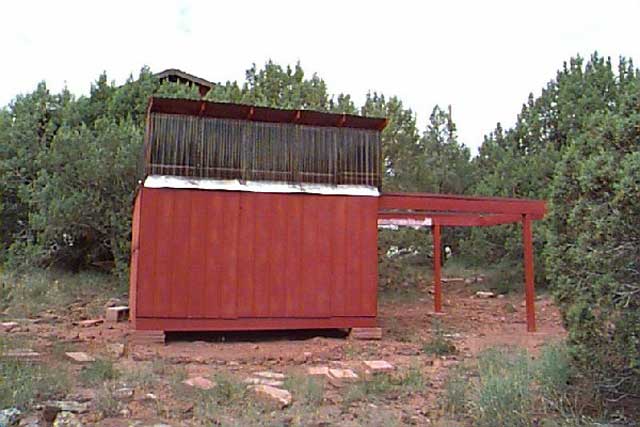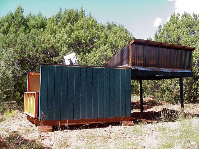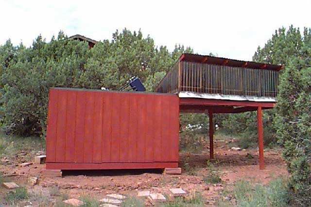 Roof closed, south wall. Here we see the "Omega Centauri" wall, that folds down for low horizon access. This enables me to see the famous globular in a clear low southern sky, just skirting the top of the pine trees. (63k)
