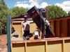 Roof rolled off, eastern side. Here we see the lexan and tin roof rolled to the north, and although the scope is folded down, the single sided truss allows good access to the northern sky as well. (66k)