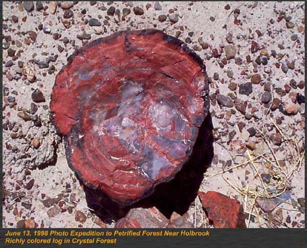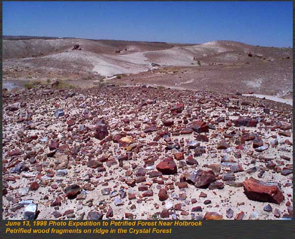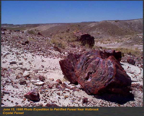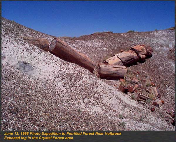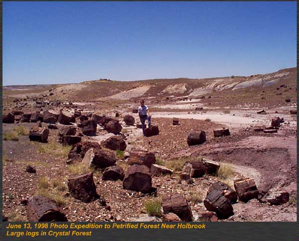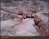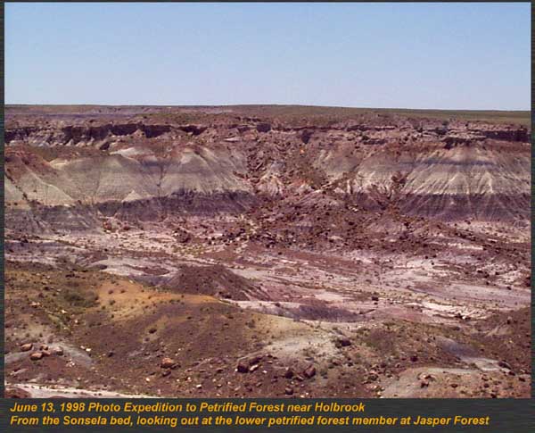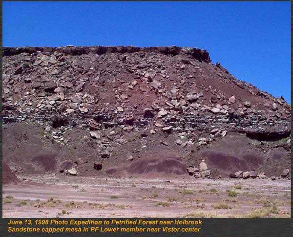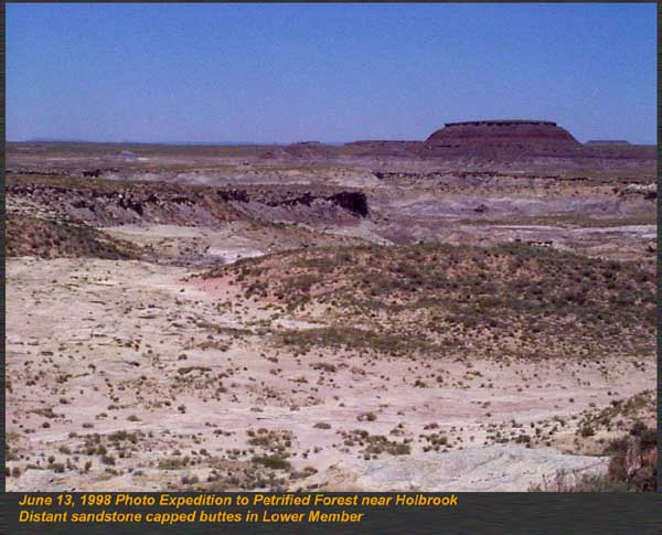 PETRIFIED FOREST FORMATION The Petrified forest formation is the most widespread stratigraphic unit of the Chinle Group. The type locality is contained within the famous Petrified Forest east of Holbrook and was recently upgraded from member to formation status. BLUE MESA MEMBER (Lower Petrified Forest member) Blue and grey badlands characterized this extensive unit, which make up the rugged and colorful low eroded hills of North Eastern Arizona and the Petrified Forest East of Holbrook. It is the most widespread unit member of the Chinle formation, and is over 300 feet thick in the Defiance Plateau region. Composed of tinted impure tuffaceous materials and mudstones, the unit is very fossiliferous in many areas and contain a rich assemblage of vertebrate and invertebrate fossils. Commonly encountered in the Blue Mesa member are flat sandstone capped buttes formed by the weathering of the softer mudstones and siltstones forming slopes against the much more resistant sandstone caps. Eventually, undercutting of the cap causes it to break off in plates which slide down the slopes. Taken in the Petrified Forest National Park (PFNP). Near the visitors center of the Petrified forest, this close up shows the sandstone cap breaking off in plates from erosional undercutting. Although the sandstones form traceable facies in the park, they have no official names, however several studies refer to them as numbered beds, such as "sandstone bed #1", etc. Most of the well known deposits of petrified logs found in the Blue Mesa member off the Chinle are found in washes and gullies. The white bentonite clays are covered with cherts and bits of petrified wood, and because of the bentoites expansion and contraction with water, no plant life can live in it, creating an almost alien environment. The Crystal forest, Petrified Forest National Park. Another important sedimentary "structure" is the concentration of silicified wood on the tops of hills and ridges. This is caused by the bentonites and siltstones eroding away by solution, and leaving the insoluble cherts and wood behind. This was taken in the Crystal Forest, PFNP. Although the large logs of multicolored petrified wood seem perfectly preserved in every detail, most are replaced completely by silica, and do not retain the cellular detail found in logs that are permineralized. The source for much of the wood is the Sonsela Sandstone, the overlying unit, and as the mudstones wash away by erosion, the wood concentrates in the Blue Mesa Member. In the washes just below the Sonsela, many of the logs are still intact, since they have not traveled far from the source. This large silicified log is fracturing along planes not found in the original tree, since the original structures have been completely replaced by an infilling of microcrystaline quartz. Crystal Forest image (PFNP). The Author is seen here amongst the many silicified remains of some large trees along a wash in the Crystal Forest at Petrified Forest National Park. Some of the logs are up to a meter in diameter! The upper sandstone bed seen here at Jasper Forest in the Petrified Forest is the source for most of the petrified wood in the Blue Mesa member below. The Blue Mesa member is seen here as the typical blue and lavender bentonites and siltstone forming badlands topography. Large two foot log section at the Petrified forest, in the Crystal forest area. Iron and manganese form the red colorations as impurities in the silica that has replaced the wood. While virtually no original cellular detail remains, the exterior of the cast does recall the exact wood structure of the bark and underlying wood of the original tree (PFNP). |