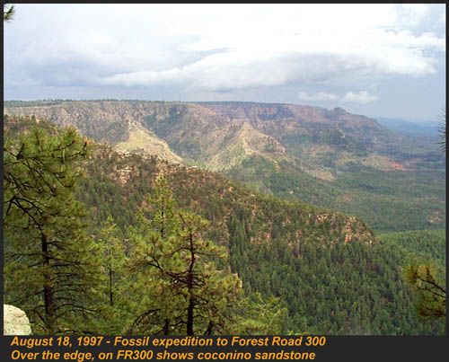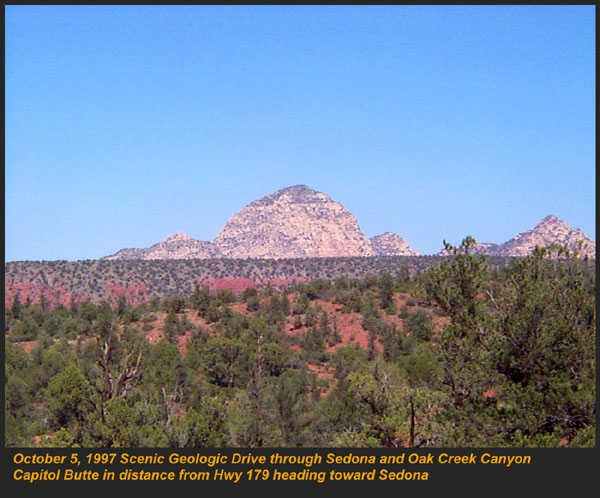 This Permian Terrestrial sequence was formed as a dune eolian deposit 270 to 265 million years ago, and exhibits the typical high angle cross bedding and sandy texture of such deposits. The formation is widespread over much of the Mogollon Rim, and forms a thick unit over the Schnebly Hill Formation's Sycamore Pass member, and lies under the Kaibab Limestone. As you might expect, the Coconino represents a Sahara type desert, left behind by the regressing Pedregosa Sea. The beds contains "locally abundant" trace fossils of mammal like reptiles, spiders, scorpions, lizards, and raindrop impressions, and extremely rare plant impressions. CLICK ON THE FOLLOWING SELECTIONS FOR A LARGER VIEW: On the tunnel trail on Forest Road 300 - the Rim Road, the Coconino outcrops all along the trail. Here we can see the dune pattern cross bedding planes weathering to a dull gray color. The less weathered material is yellowish, and can be seen to the lower left. From the top of the Mogollon Rim, just off the Rim Road, the yellow colored Coconino sandstone forms spectacular outcrops along the Rims face, often with a cap of the marine Kaibab Limestone. On highway 89a out of Sedona, numerous isolated outcrops occur along the roadway. In this image, the yellow Coconino Sandstone thrusts out of a ridge to form a spectacular cliff. The ridge just behind is completely volcanic, with basalt capping the top. I took this one in the parking lot of the Dairy Queen recently. Capitol Butte seen in the distance from the village of Oak Creek. This dome shaped hill, nicknamed because of its resemblance to the Capitol Building in Washington DC, is composed entirely of Coconino Sandstone. |
