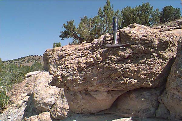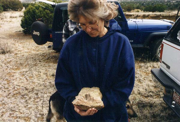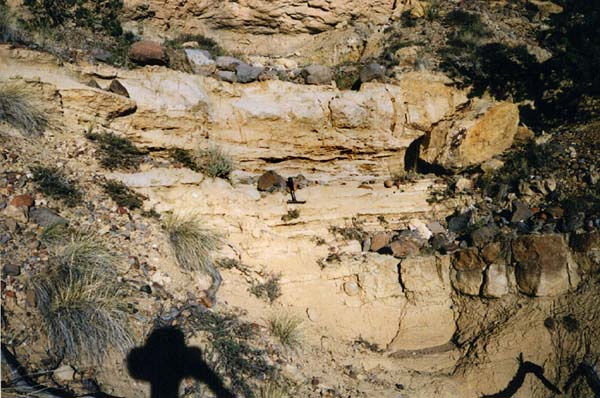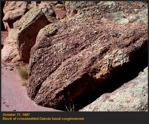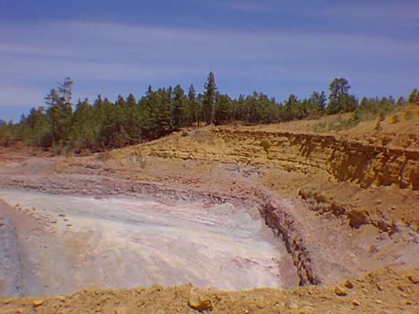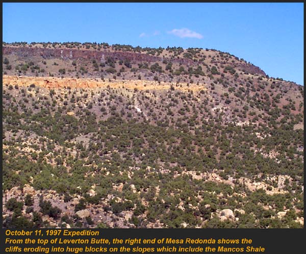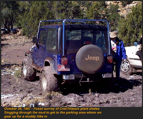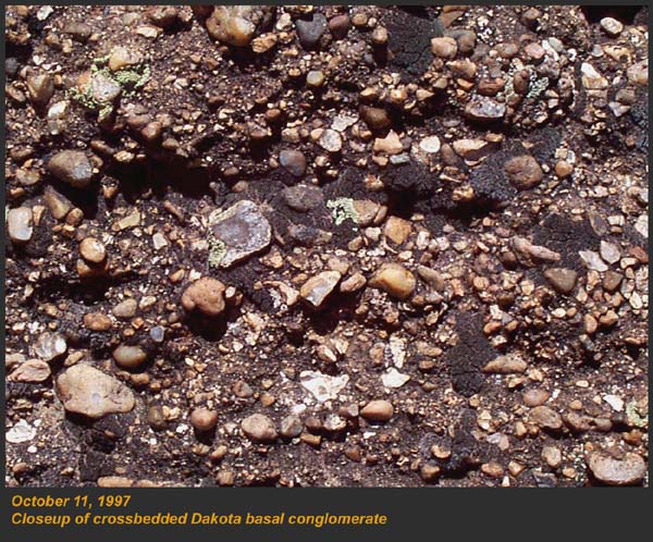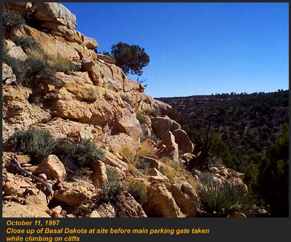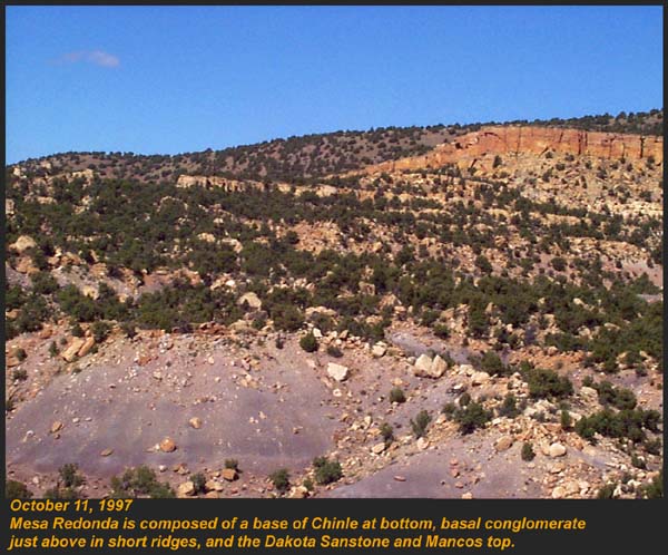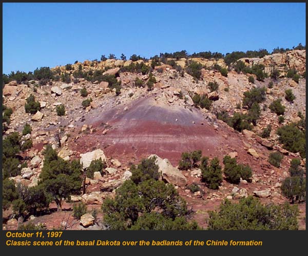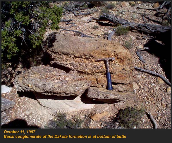 The southwestern margin of the Cretaceous Western Interior Seaway laid extensive deposits in Arizona from the westernmost exposures near Pinedale to the Arizona-New Mexico border along the Mogollon Rim. Consisting of the intertongueing Dakota and Mancos Formations, it ranges in age from Cenomanian to Turnonian. The transgressive-regressive sediments consist of a sequence of sandstones, shales and limestones and represent fluvial, coastal and marine shelf environments. The stratigraphic units in Arizona have been primarily extended from the New Mexico terminology by Wolfe and others to the following units: A basal unit, consisting of primarily a conglomerate of erosional clasts from the pre cretaceous underlying units of the Triassic Chinle formation, and meta sedimentary deposits from pre-Paleozoic volcanics. This unit has been named the Cliff Dwellers Sandstone of the Dakota formation and is up to 15 meters thick towards the eastern extensions of this study area. Overlying the Cliff Dwellers Member of the Dakota is an intertongueing series of shaley beds that are three separate formations in New Mexico that pinch out around the Show Low area. They are in ascending sequence, the Clay Mesa Shale, Paguate Sandstone, and the Whitewater Arroyo members of the Mancos Shale. However, around the study area, the three are very thin, and have been combined to one 10 to 20m thick bed called the Clay Mesa/Whitewater Arroyo tongue of the Mancos Shale. Conformably overlaying the above group is the Twowells Tongue of the Dakota Formation. This is the commonly seen yellow sandstone beds in and around the Show Low area, forming sometimes highly crossbedded massive cliffs and escarpments. It ranges in thickness from 10 to 20 meters in the study area and usually contains several limestone shell lag beds near the top ranging in thickness up to 10 meters and containing dominantly the mollusks Exogyra Levis and Pinna Petrina. A tertiary basalt cap overlies the previous formation in much of the area especially in the eastern end of the section. The Cretaceous sediments in Show Low - Pinedale area are locally fossiliferous, containing a dominantly molluscan macrofauna including oysters, ammonites, nautiloids and Pinnas, with an occasional shark or crocodile tooth. Terrestrial deposits include large amounts of permineralized wood, impressions of leaves and plant parts, and freshwater clams. From the westernmost extension near Pinedale, to east of Show Low, the Cretaceous deposits in Arizona lie with either planar or angular unconformity over Triassic sediments. This can be seen clearly along Highway 260 past Heber, where the Moenkopi redbeds outcrop along numerous roadcuts, followed by an onlapping of sandy Cretaceous sediments. West of Show Low, the colorful Chinle bentonites form badlands topography in many canyons, with the overlying yellowish strata assignable to either the Twowells Sandstone, or the Cliff Dwellers member of the Dakota. Large truck sized blocks of the basal Cliff Dwellers Member of the Dakota at Mesa Redonda overlay the bluish Triassic badlands of the Chinle formation.The basal is a bit lighter in color than the distant yellow Twowells Sandstone cliffs due to large amounts of included cherts derived from the underlying Chile formation. Standing on a localized pile of basal conglomerate, Mesa Redonda looms in the distance. The massive yellow cliff is primarily Twowells Sandstone overlain by a deposit of black tertiary basalt as a cap. The slope leading up to the cliff is a mixture of the Cliff Dwellers member overlain by a scree slope of eroded material from the Twowells above. A closer look at the Mesa Redonda revealing the very thick 15 meter basalt cap eroding onto the lower slopes below the Twowells sandstone. The Clay Mesa/Whitewater Arroyo member is almost completely concealed by this rubble and only outcrops in thinly exposed units. One of my favorite scenes, the rounded multicolor hills of the Triassic Chinle Formation directly overlain by the blocky ledge of the Cliff Dwellers member of the Dakota. Note the large boulders that have rolled down from the ledge over the the dominantly gray and lavender bentonite (clay) beds of the Chinle. Trying to drive into an area at the base of the Cliff Dwellers Member of the Dakota formation (basal) can be a challenge sometimes after a rain! Our Jeep and other four wheel drive vehicles are essential at times to be able to fully explore the Mesozoic stratigraphy. The basal Dakota Formation is called the Cliff Dwellers member, as extended from stratigraphically equivalent deposits from Cliff Dwellers Canyon, seven miles northeast of Gallup, New Mexico by Wolfe in 1989. Attributed to deposits of gravelly fluvial stream deposits over wide areas, this non marine unit is too coarse to preserve finely detailed fossils, however occasional pieces of abraded Triassic wood, and bark and limb impressions in some siltstone facies can be found. The clasts contained in the conglomerates are primarily angular to well rounded black and white cherts and silicified wood derived from erosional processes from the underlying Chinle Formation. Occasional Paleozoic fossils in cherts are also mixed in rarely from apparently more distant sources such as rugose corals from the permian Kaibab formation. The lithology near the center of Show Low is more variable, Wolfe correlated the Cliff Dwellers with a ruddy coarse grained sandstone, with volcanic derived clasts only a meter or so thick. Near Pinedale, the basal members appear to be represented by coarse yellow sandstones over large areas. East of Show Low a very typical scene of the yellow Cliff Dwellers Member overlain by a black, sometimes columnar basalt that is Tertiary in age. The ground is an erosional alluvium from the cliff, and consists of yellow sand, black and white chert pebbles, and some bentonite deposits. The basal conglomerates of the Cliff Dweller member can be recognized easily at a distance by the round