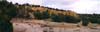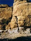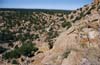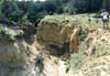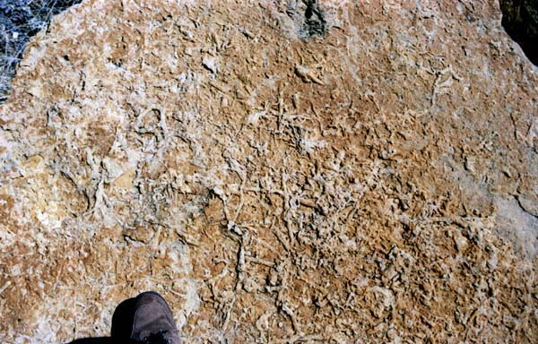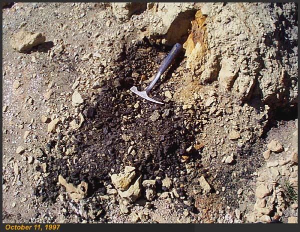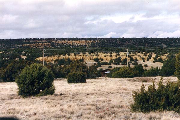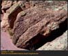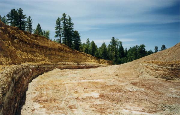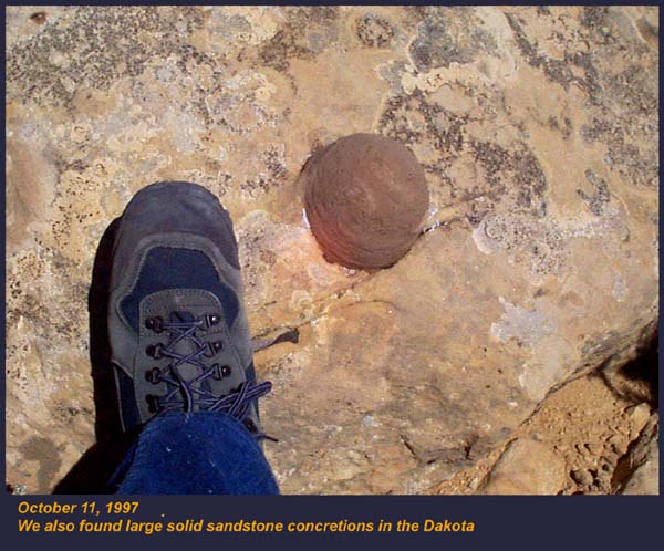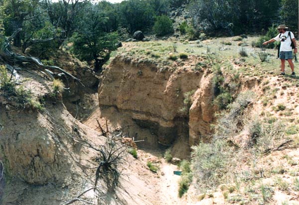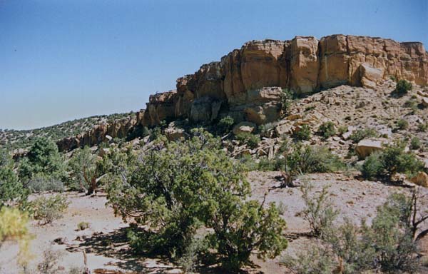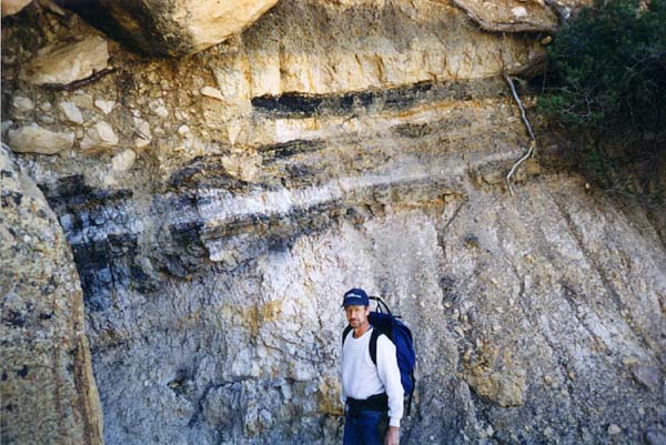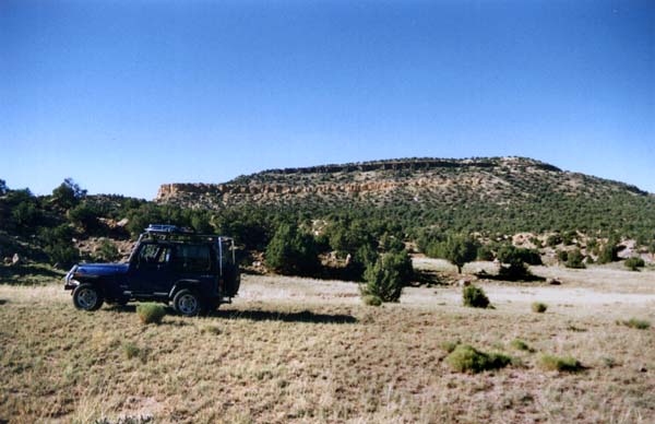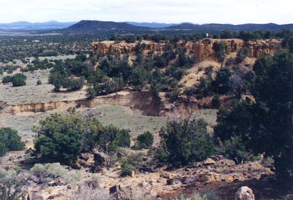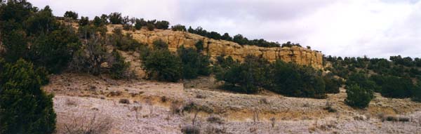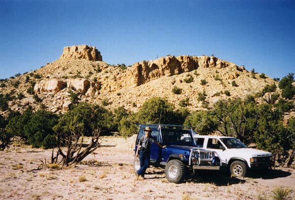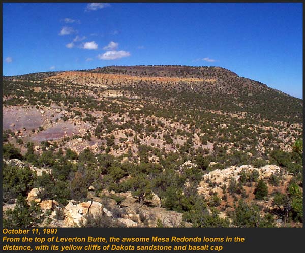 The southwestern margin of the Cretaceous Western Interior Seaway laid extensive deposits in Arizona from the westernmost exposures near Pinedale to the Arizona-New Mexico border along the Mogollon Rim. Consisting of the intertongueing Dakota and Mancos Formations, it ranges in age from Cenomanian to Turnonian. The transgressive-regressive sediments consist of a sequence of sandstones, shales and limestones and represent fluvial, coastal and marine shelf environments. The stratigraphic units in Arizona have been primarily extended from the New Mexico terminology by Wolfe and others to the following units: A basal unit, consisting of primarily a conglomerate of erosional clasts from the pre cretaceous underlying units of the Triassic Chinle formation, and meta sedimentary deposits from pre-Paleozoic volcanics. This unit has been named the Cliff Dwellers Sandstone of the Dakota formation and is up to 15 meters thick towards the eastern extensions of this study area. Overlying the Cliff Dwellers Member of the Dakota is an intertongueing series of shaley beds that are three separate formations in New Mexico that pinch out around the Show Low area. They are in ascending sequence, the Clay Mesa Shale, Paguate Sandstone, and the Whitewater Arroyo members of the Mancos Shale. However, around the study area, the three are very thin, and have been combined to one 10 to 20m thick bed called the Clay Mesa/Whitewater Arroyo tongue of the Mancos Shale. Conformably overlaying the above group is the Twowells Tongue of the Dakota Formation. This is the commonly seen yellow sandstone beds in and around the Show Low area, forming sometimes highly crossbedded massive cliffs and escarpments. It ranges in thickness from 10 to 20 meters in the study area and usually contains several limestone shell lag beds near the top ranging in thickness up to 10 meters and containing dominantly the mollusks Exogyra Levis and Pinna Petrina. A tertiary basalt cap overlies the previous formation in much of the area especially in the eastern end of the section. The Cretaceous sediments in Show Low - Pinedale area are locally fossiliferous, containing a dominantly molluscan macrofauna including oysters, ammonites, nautiloids and Pinnas, with an occasional shark or crocodile tooth. Terrestrial deposits include large amounts of permineralized wood, impressions of leaves and plant parts, and freshwater clams. From the westernmost extension near Pinedale, to east of Show Low, the Cretaceous deposits in Arizona lie with either planar or angular unconformity over Triassic sediments. This can be seen clearly along Highway 260 past Heber, where the Moenkopi redbeds outcrop along numerous roadcuts, followed by an onlapping of sandy Cretaceous sediments. West of Show Low, the colorful Chinle bentonites form badlands topography in many canyons, with the overlying yellowish strata assignable to either the Twowells Sandstone, or the Cliff Dwellers member of the Dakota. Large truck sized blocks of the basal Cliff Dwellers Member of the Dakota at Mesa Redonda overlay the bluish Triassic badlands of the Chinle formation.The basal is a bit lighter in color than the distant yellow Twowells Sandstone cliffs due to large amounts of included cherts derived from the underlying Chile formation. Standing on a localized pile of basal conglomerate, Mesa Redonda looms in the distance. The massive yellow cliff is primarily Twowells Sandstone overlain by a deposit of black tertiary basalt as a cap. The slope leading up to the cliff is a mixture of the Cliff Dwellers member overlain by a scree slope of eroded material from the Twowells above. A closer look at the Mesa Redonda revealing the very thick 15 meter basalt cap eroding onto the lower slopes below the Twowells sandstone. The Clay Mesa/Whitewater Arroyo member is almost completely concealed by this rubble and only outcrops in thinly exposed units. One of my favorite scenes, the rounded multicolor hills of the Triassic Chinle Formation directly overlain by the blocky ledge of the Cliff Dwellers member of the Dakota. Note the large boulders that have rolled down from the ledge over the the dominantly gray and lavender bentonite (clay) beds of the Chinle. Trying to drive into an area at the base of the Cliff Dwellers Member of the Dakota formation (basal) can be a challenge sometimes after a rain! Our Jeep and other four wheel drive vehicles are essential at times to be able to fully explore the Mesozoic stratigraphy. The basal Dakota Formation is called the Cliff Dwellers member, as extended from stratigraphically equivalent deposits from Cliff Dwellers Canyon, seven miles northeast of Gallup, New Mexico by Wolfe in 1989. Attributed to deposits of gravelly fluvial stream deposits over wide areas, this non marine unit is too coarse to preserve finely detailed fossils, however occasional pieces of abraded Triassic wood, and bark and limb impressions in some siltstone facies can be found. The clasts contained in the conglomerates are primarily angular to well rounded black and white cherts and silicified wood derived from erosional processes from the underlying Chinle Formation. Occasional Paleozoic fossils in cherts are also mixed in rarely from apparently more distant sources such as rugose corals from the permian Kaibab formation. The lithology near the center of Show Low is more variable, Wolfe correlated the Cliff Dwellers with a ruddy coarse grained sandstone, with volcanic derived clasts only a meter or so thick. Near Pinedale, the basal members appear to be represented by coarse yellow sandstones over large areas. East of Show Low a very typical scene of the yellow Cliff Dwellers Member overlain by a black, sometimes columnar basalt that is Tertiary in age. The ground is an erosional alluvium from the cliff, and consists of yellow sand, black and white chert pebbles, and some bentonite deposits. The basal conglomerates of the Cliff Dweller member can be recognized easily at a distance by the round