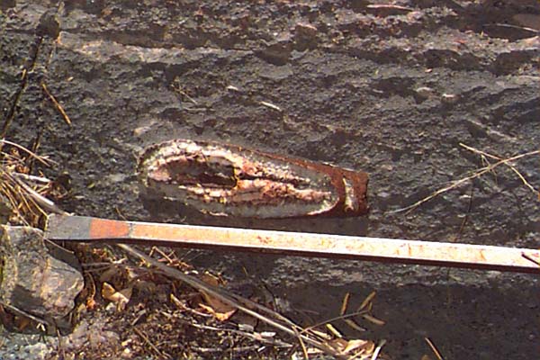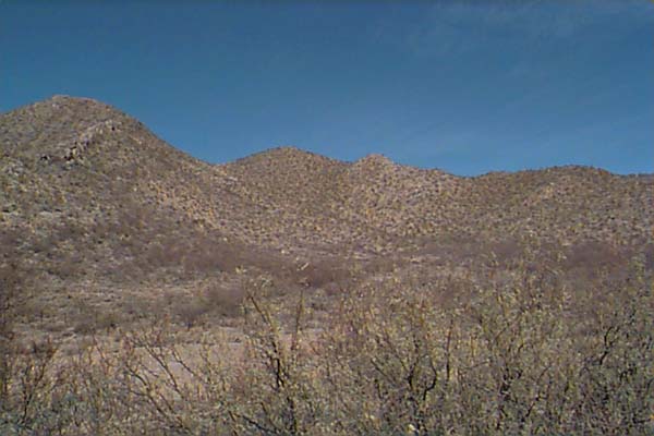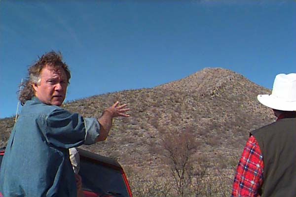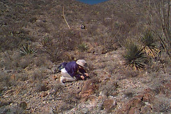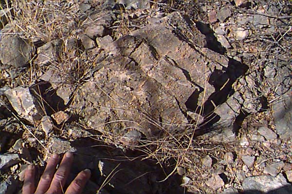 The El Paso Limestone lies unconformably on the Coronado Quartzite in Greenlee county, and on the Abrigo and Bolsa Quartzite in the Dos Cabezas Mountains. It can attain thicknesses of several hundred feet, and is upper Cambrian to lower Ordovician in age. Of great interest to us was the Ordovician component at Dos Cabezas, where we found fossils of gastropods, and orthocone cephalopods replaced with red chert in a limestone matrix. Most of the Ordovician rocks were removed from Arizona by erosion, and what little remains is in isolated outcrops in remote localities. Gordon Nelson points out the ridge like outcrop in the distance in the foothills of the Dos Cabezas Mountains that is the El Paso Limestone. The Abrigo is off to the right down the hill, which is the Cambrian. The outcrop is only a few hundred feet thick here, and the exposure is small. Rick Hill, a "paleo-astronomer" such as myself, is on the right. Another view at the base of the Dos Cabezas of the Abrigo Limestone straight ahead, and the Ordovician outcrop to the left. My wife Dawn picks through the outcrop on the ridge to find good specimens of Ordovician flat spiral shaped gastropods, which filled the rocks in this area. The rock in outcrop is dark and weathered, with a coating of desert varnish. The red specks in this rock are parts and whole gastropods. They occurred in specific layers on the ridge, and were largely ground up pieces of thin shell sections. A close up of an orthocone cephalopod (Orthoceras??) found in situ. We were able to remove it in one piece, but found out that this limestone is like pounding on concrete to free specimens! |